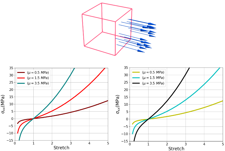The analytical solution for the uniaxial stretch for different shear modulus could be obtained using this code: